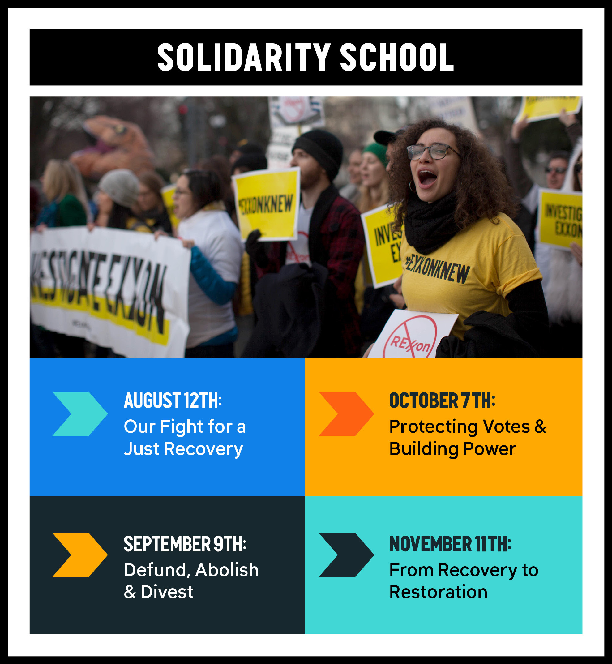 “The Solidarity School series will kick-off with a focus on Our Fight for a Just Recovery. We’ll provide foundational knowledge about what a “just recovery” means for 350.org and share our principles and values. We’ll hear how workers’ rights and the fight for racial justice intersect and how both connect with climate justice.