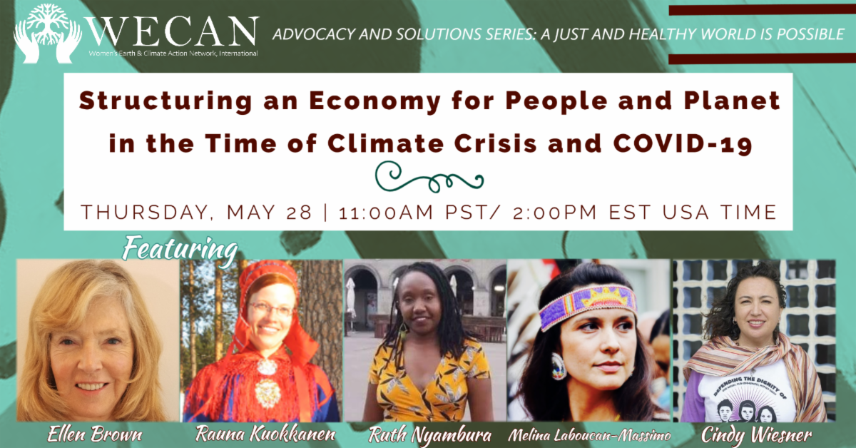 FreePlease be invited to join the Women’s Earth and Climate Action Network (WECAN) on Thursday, May 28 for our upcoming webinar, “Structuring an Economy for People and Planet in the Time of Climate Crisis and COVID-19”. During this dynamic dialogue women and feminists from different regions of the world will unite to discuss alternative economies that counteract extractive economic systems, colonization, racism, and patriarchy— and instead visibilize women’s labor, center Indigenous knowledge, and prioritize people and planet. There could not be a more important time to ensure we do not go back to business as usual.