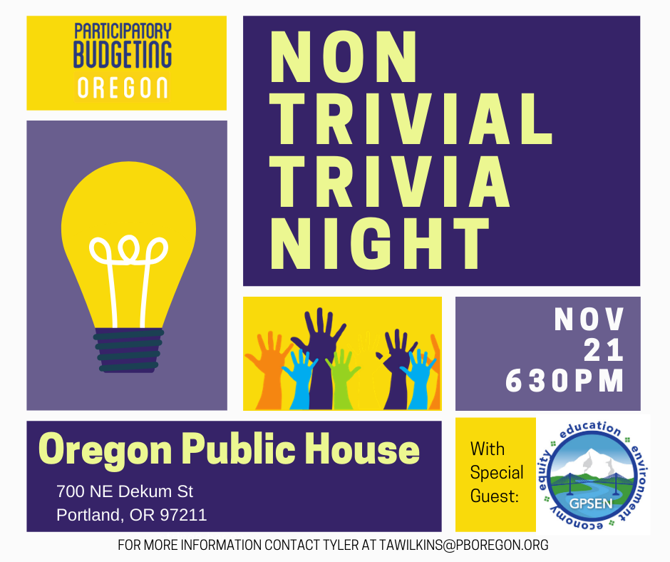 Join GPSEN and Participatory Budgeting Oregon for a night of civics trivia! Think you know your local government? Put it to the test at the Oregon Public House, Thursday November 21, from 6:30-9:30. There will be prizes for the winners and fun for everyone, as well as an opportunity to learn more about a great organization in the company of some wonderful people. Donations to the cause will be happily accepted! See you there!