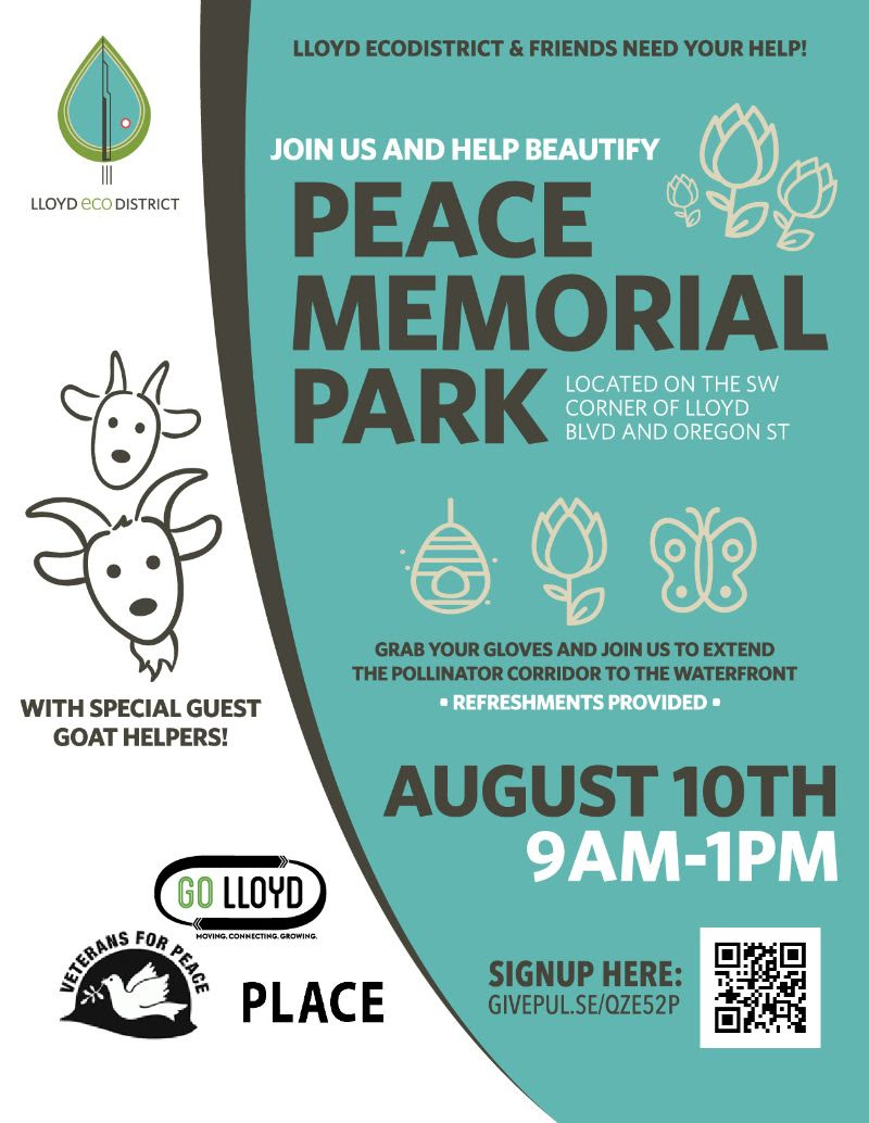 FreeThis is a great way to become involved in a community beautification project here in the Lloyd neighborhood. Thousands of people walk and ride their bikes by this space every day and we aim to make it a place where people, and pollinators, can take a moment to enjoy the beauty of Portland. This space will enhance the original message of peace that Veterans For Peace created in the space, and include a pollinator garden, with information on their importance to our ecosystem. Soon we will be showcasing 3 park redesign options to gather public input on what the final design should be. Project partner PLACE Studios is providing the design alternatives and we will send information for when and where the meeting will be held. For now please join us, and the goats, this Saturday to keep the park looking good!