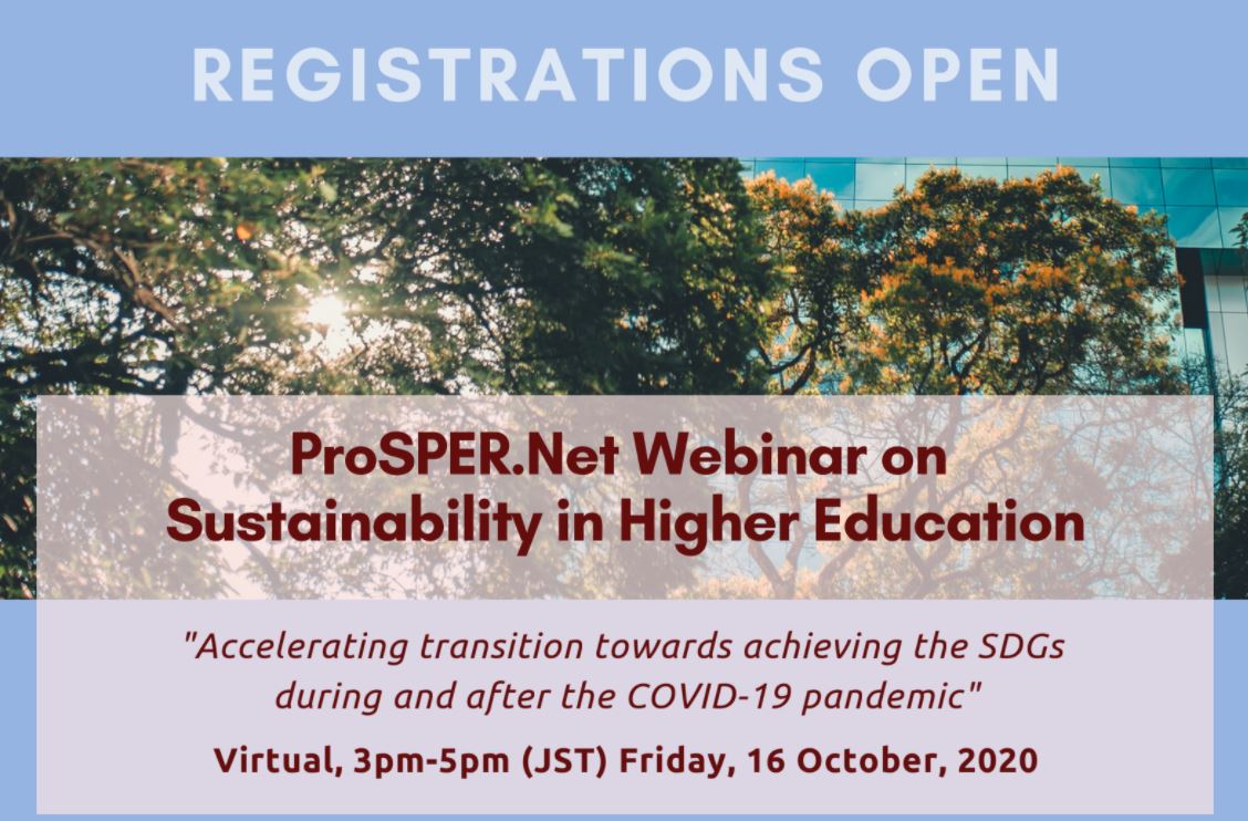 FreeUnited Nations University Institute for the Advanced Study of Sustainability (UNU-IAS) will organise a ProSPER.Net Webinar on Sustainability in Higher Education, ‘Accelerating transition towards achieving the SDGs during and after the COVID-19 pandemic’, at 3pm-5pm (JST) on Friday, 16 October, 2020.
