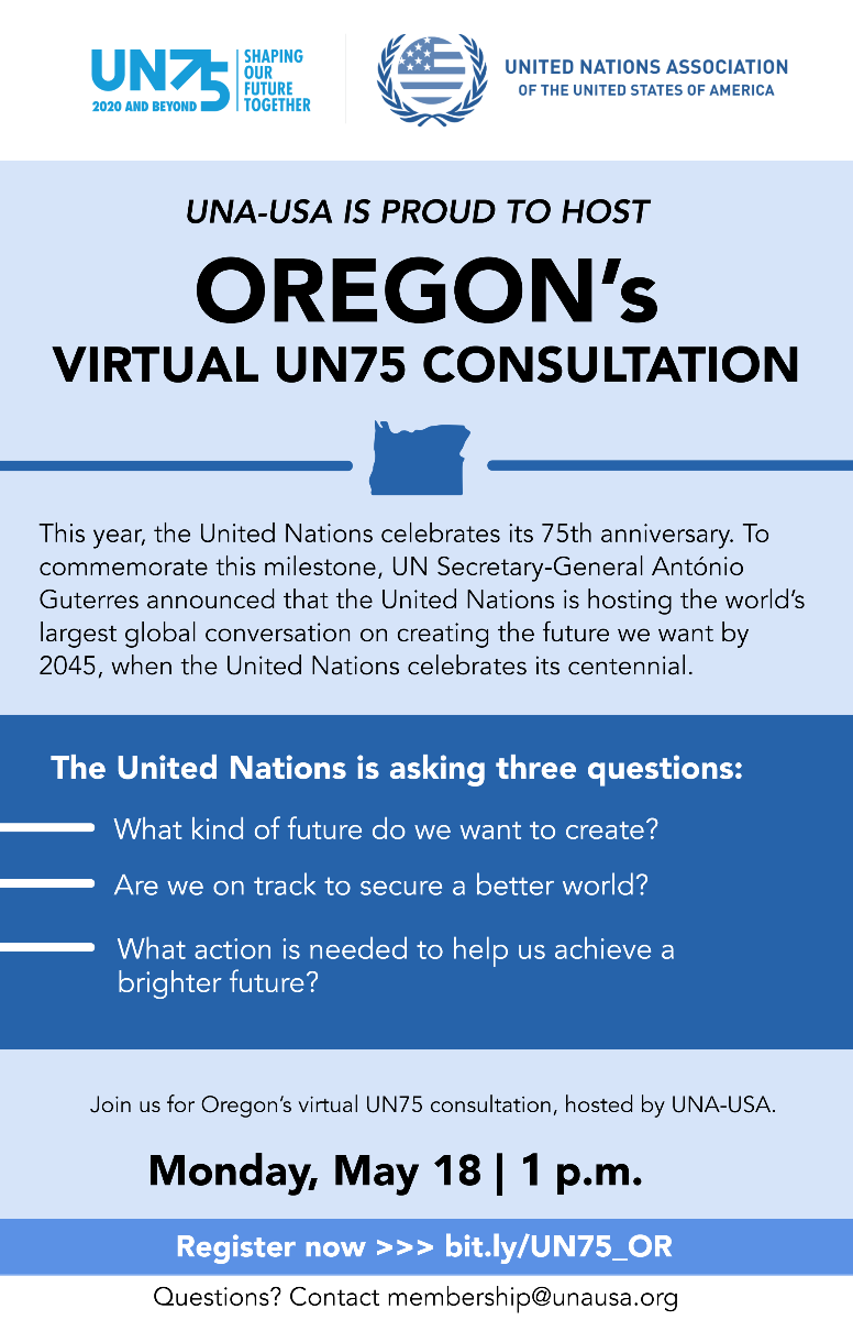 To provide UN advocates with an opportunity to share their visions and recommendations, UNA-USA is hosting virtual state-wide UN75 consultations across the country over the next few months. UNA-USA is inviting you to participate in Oregon’s virtual UN75 consultation to share your thoughts with the UN.