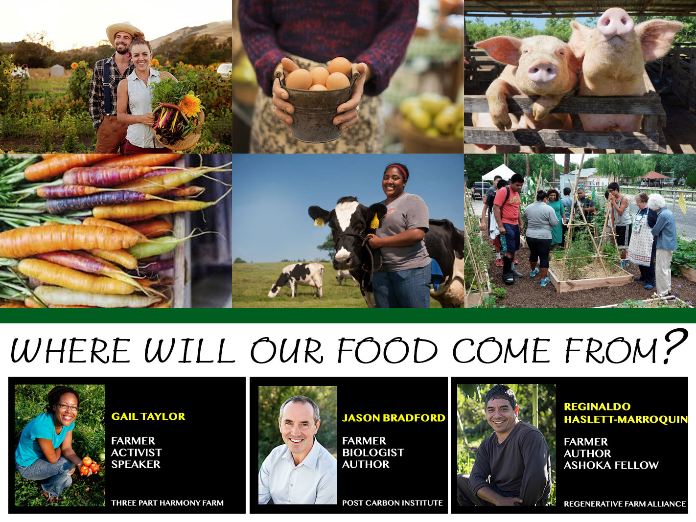 Join us or a live, online conversation with author, farmer and PCI Board President Jason Bradford, author and co-owner of Regenerative Farms Reginaldo Haslett-Marroquin, and co-owner of Three Part Harmony Farm Gail Taylor to find key leverage points where we can all work to drastically shift our food system towards long-term health and sustainability. We’ll consider what it will really mean for urban, suburban, and rural communities to rely on a highly localized and energy-efficient food systems—and we’ll discuss actionable suggestions for what can be done right now to create them.