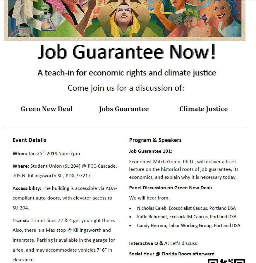Portland Community College Cascade 705 N. Killingsworth St., Portland, OR, United StatesA panel discussion of the following topics: Green New Deal, Jobs Guarantee, Climate Justice, led by Economist Mitch Green and leaders of the Ecosocialist Caucus and the Labor Working Group.