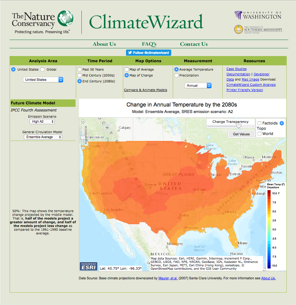 Thanks to the Nature Conservancy, the Climate Wizard provides access to leading climate change information and the ability to visualize impacts that may occur...
